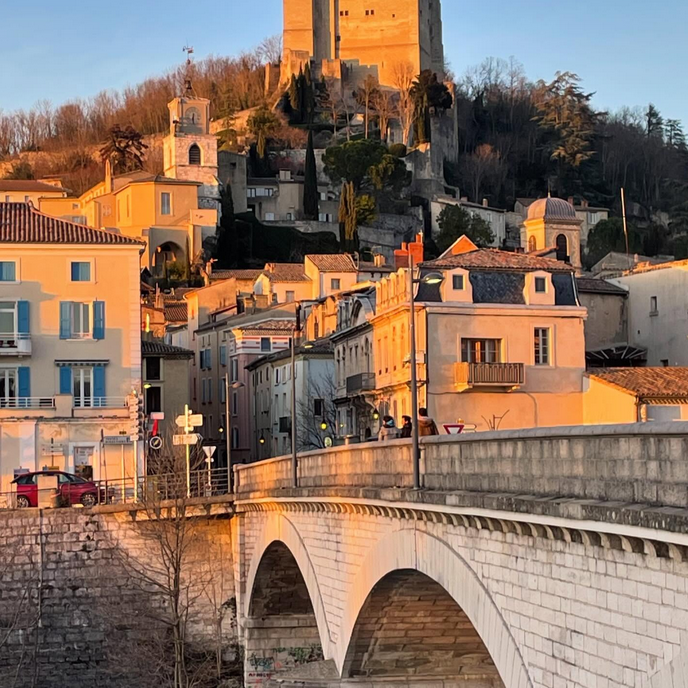 La Crête de Crest. Du pied de la Tour de Crest descend une dalle de roche inclinée à 45°, se terminant au niveau de sa lèvre en falaise de quelques mètres de hauteur. Ce banc de roches très visible sur la hauteur de la ville est le sommet de la crête, à savoir une molasse calcaire grise d'origine marine / mer peu profonde de bord de côte. Sur tout son long, telle l'épine dorsale d'un dragon, cette roche s'incline vers l'Est, saluant le levé du soleil. Au coucher du soleil, c'est le flanc Ouest qui est éclairé.
